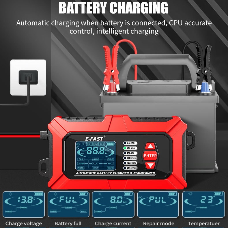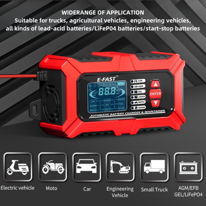 【UN ACCESORIE DE URGENTA AUTO DE TRECUTARE】Incarcatorul portabil de baterii se comporta bine ca incarcator de baterii cu plumb acid, incarcator de baterii agm, incarcator de baterii cu ciclu profund, incarcator de baterii auto, incarcator de baterii de motociclete, incarcator de baterii de barca etc.