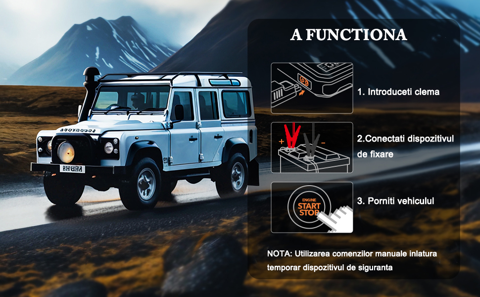 | Instructiuni: 1. Conectati sursa de alimentare si introduceti stecherul in starter auto multifunctional 2. Conectati clema placii de nichel la baterie 3. Porniti vehiculul NOTA: Utilizarea comenzilor manuale inlatura temporar dispozitivul de siguranta |