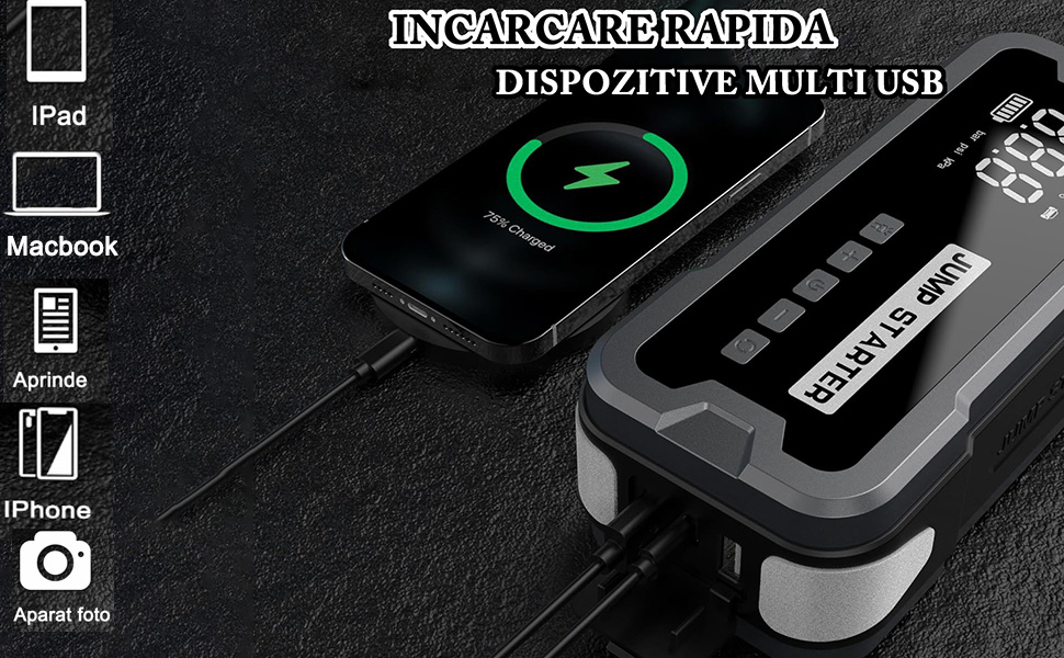 - Încărcător Portabil: Cu o capacitate de 24000 mAh, acest starter funcționează și ca un power bank, având ieșiri USB care permit încărcarea rapidă a diverselor dispozitive, cum ar fi telefoanele mobile, tabletele și multe altele.