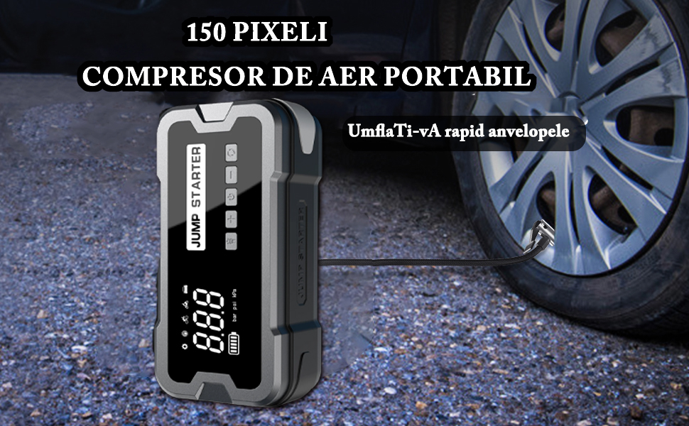 - Compresor de Aer: Cu un afisaj digital, aveți posibilitatea de a umple anvelopele la presiunea corespunzătoare. Acesta vine cu 3 moduri presetate (mașină, motocicletă, bicicletă) pentru a face umflarea anvelopelor rapid și eficient.