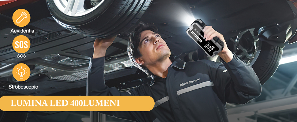 - Funcții multiple (starter auto, compresor de aer, încărcător mobil, LED de urgență).